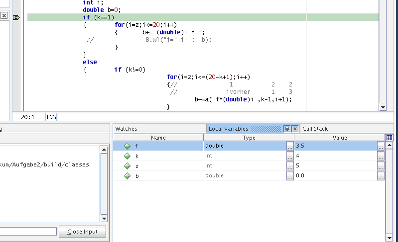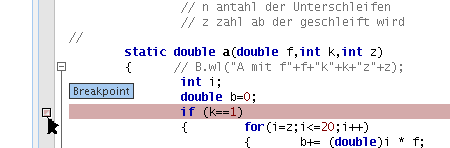 Das Programm hält dann vor Abarbeitung dieser Zeile an, und Sie können sich alle Belegungen der Variablen und Klassen zu diesem Zeitpunkt anschauen.