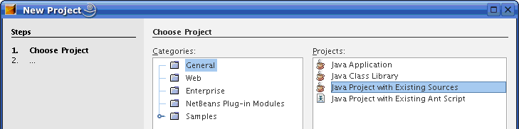 unter "Categories" : "General" und unter "Projekts" : "Java Project with Existing Sources"