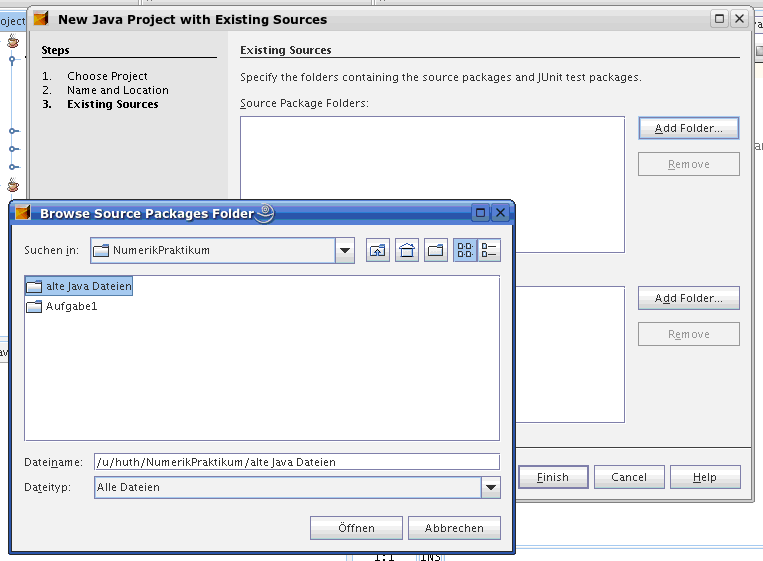 Wählen Sie mit einem Klick auf "Add Folder" den Ordner in dem sich Ihre .java Dateien befinden.